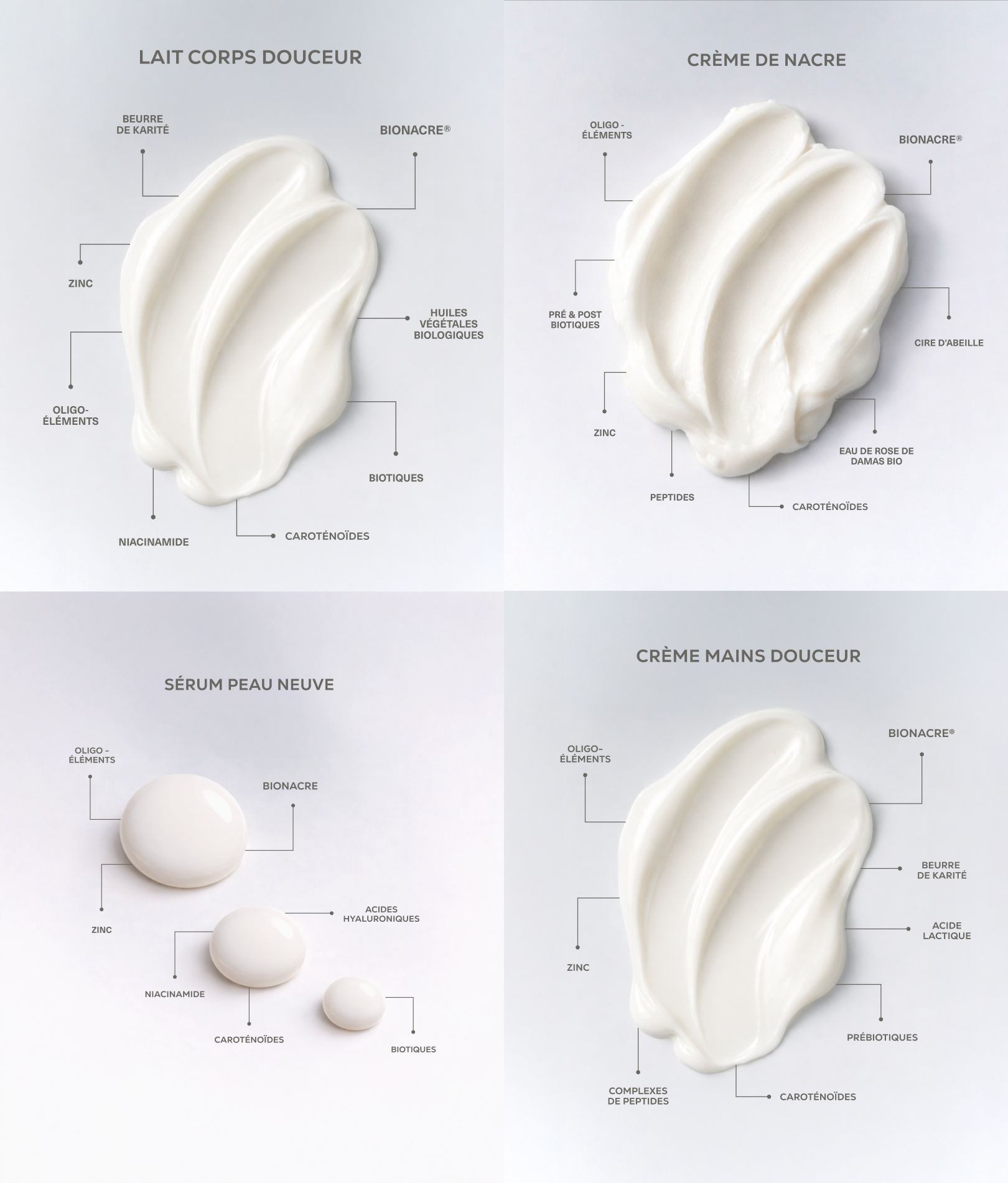 La nacre, au cœur de notre démarche, est un actif naturel aux propriétés cicatrisantes et régénérantes. Riche en minéraux marins et acides aminés, elle favorise l'hydratation et l'apaisement des peaux fragilisées. Nos soins, comme la Crème de Nacre, sont spécialement conçus pour renforcer la barrière cutanée et offrir un confort durable. Pour une routine complète, n'hésitez pas à découvrir notre gamme de soins hydratants, qui inclut des formules adaptées à tous les types de peau.