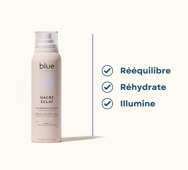 Unlike thermal water, Isotonic Mother of Pearl Water is water formulated with a defined concentration of active mother-of-pearl powder in order to obtain isotonicity. Its concentration of mineral salts and trace elements is similar to that present in our cells, promoting better affinity with the skin. It is also enriched with pre & postbiotics to maintain a balanced skin microbiota.