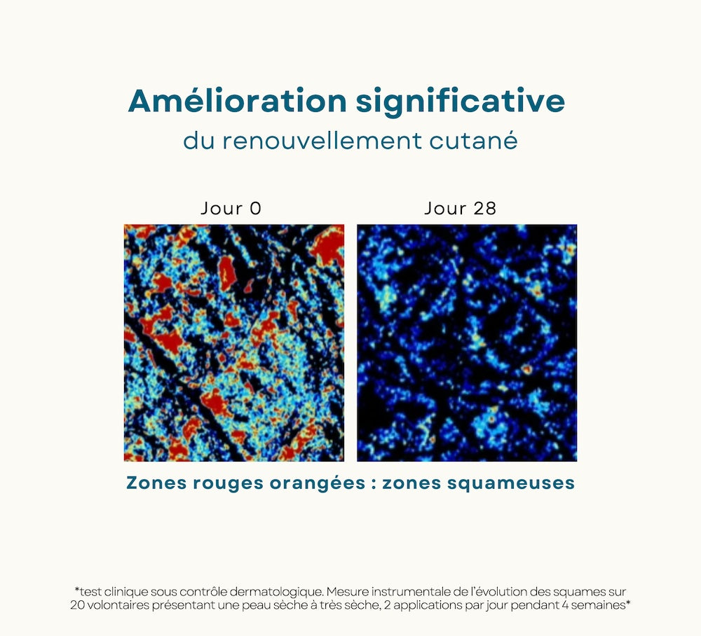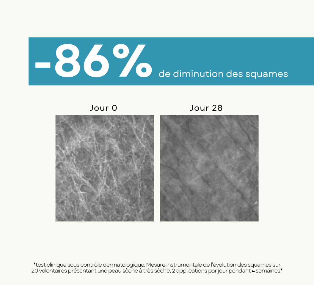 *Test clinique sous contrôle dermatologique sur 20 volontaires présentant une peau sèche à très sèche, 2 applications par jour pendant 4 semaines.
