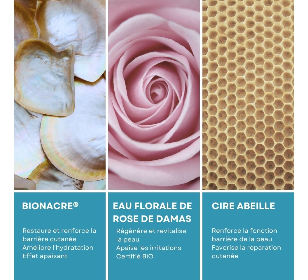 Minerals, essential proteins, complex lipids and polysaccharides combine to repair and regenerate the epidermis, while strengthening the skin barrier.