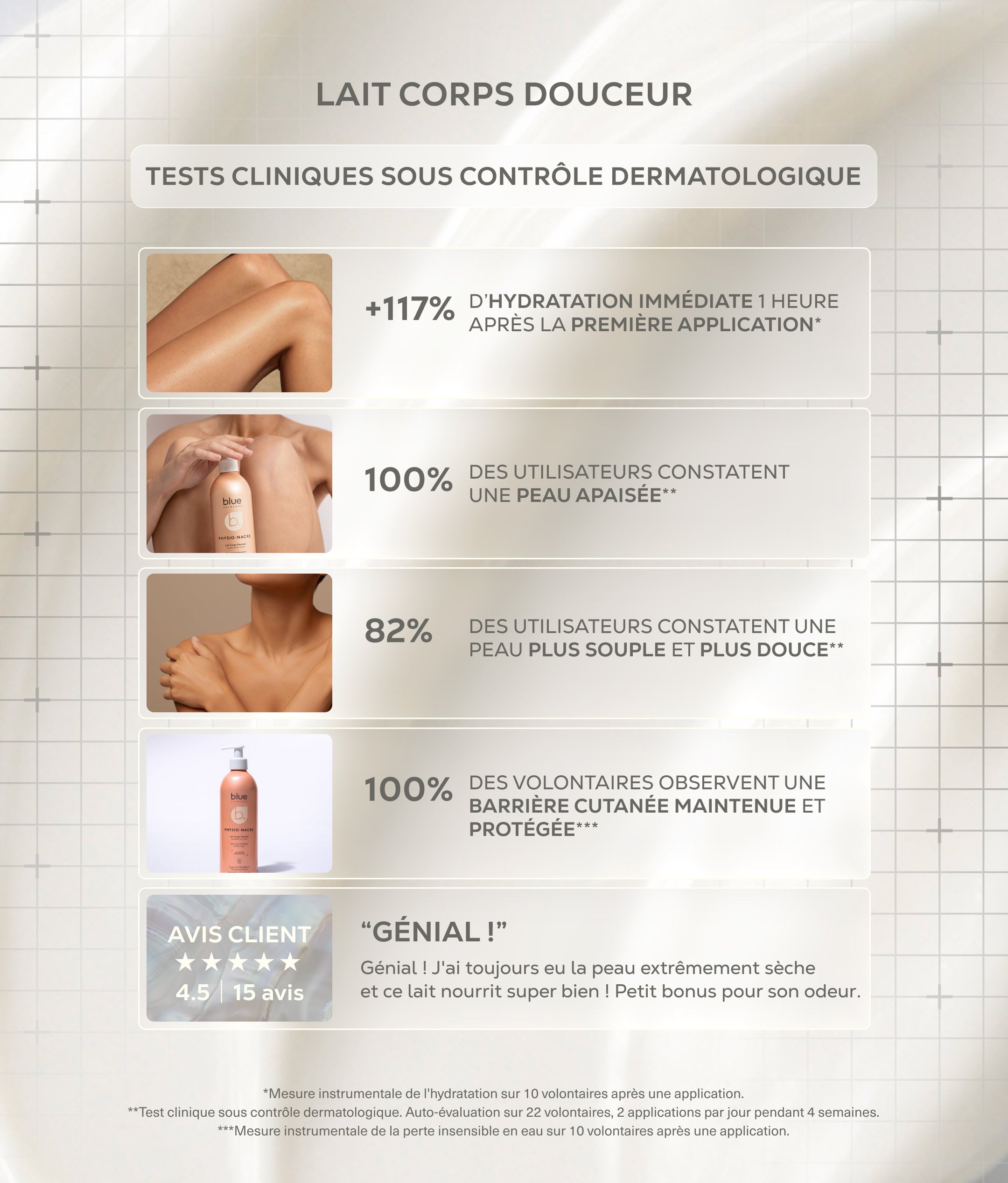 Our Gentle Body Milk was not developed or tested for facial use. For a radiant and plumped complexion, we recommend following the beauty routine of our NACRE ECLAT range, specifically designed for the face.