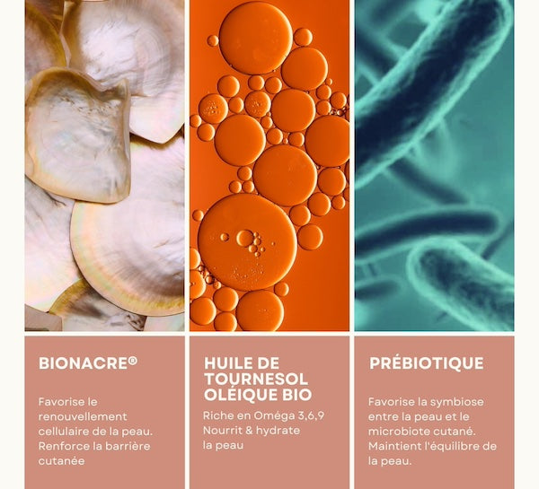 Minerals, essential proteins, complex lipids and polysaccharides combine to repair and regenerate the epidermis, while strengthening the skin barrier.