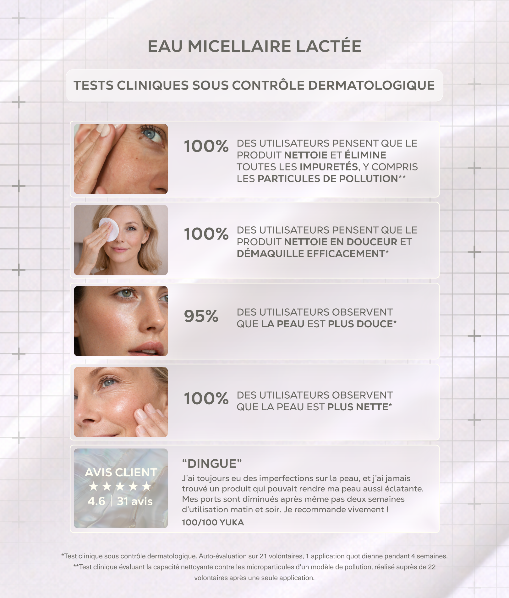 Our Milky Micellar Water is composed of ultra-gentle cleansing agents because they are non-foaming. Its milky texture allows it to be applied with a washable cotton wipe or by massaging with the fingers for even more softness. Enriched with vegetable oil, impurities are dislodged while respecting the skin film. It will delight all skin types, even the driest and most sensitive.