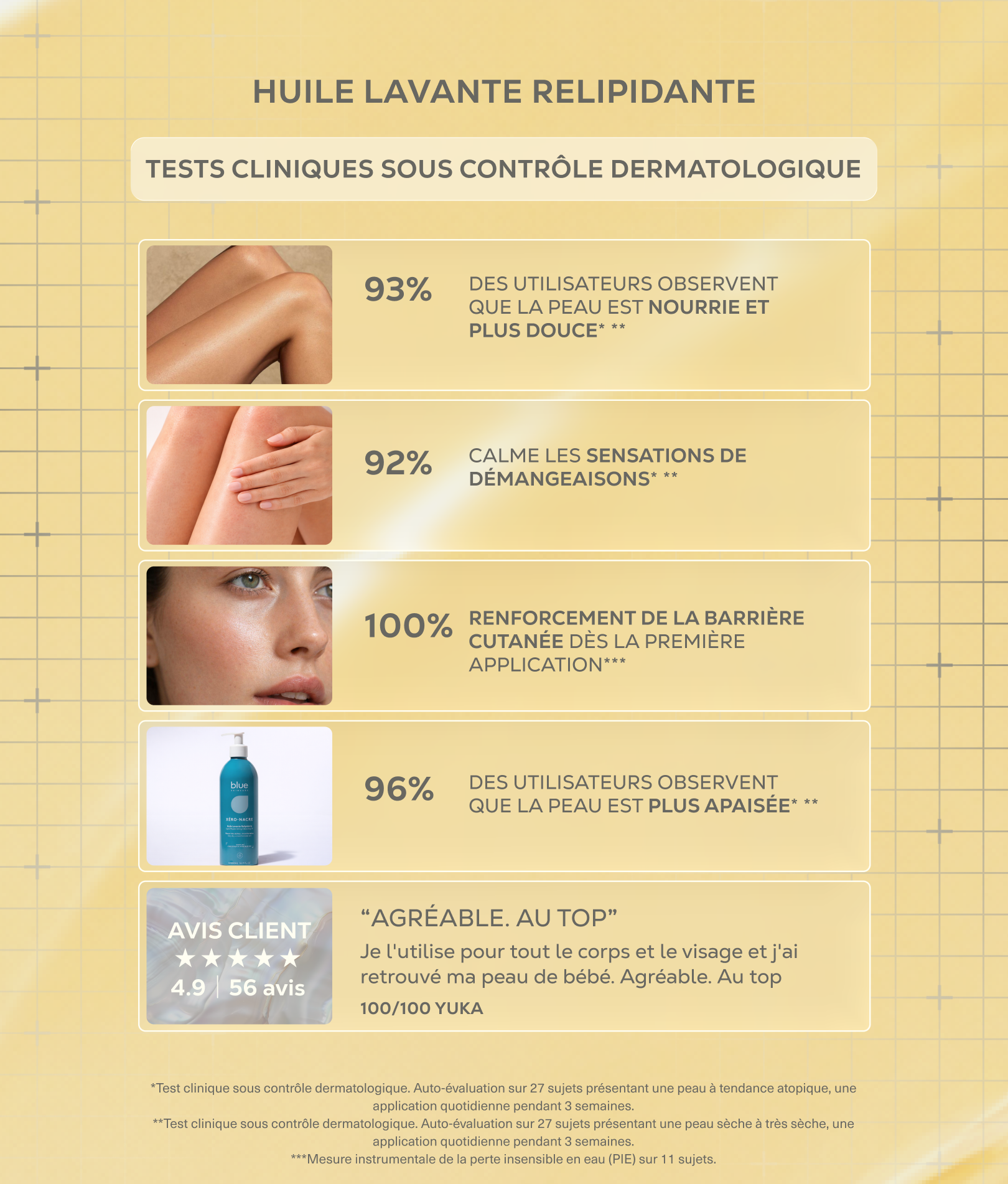 2 Clinical test under dermatological control. Self-assessment on 27 subjects with dry to very dry skin, with daily application for 3 weeks.