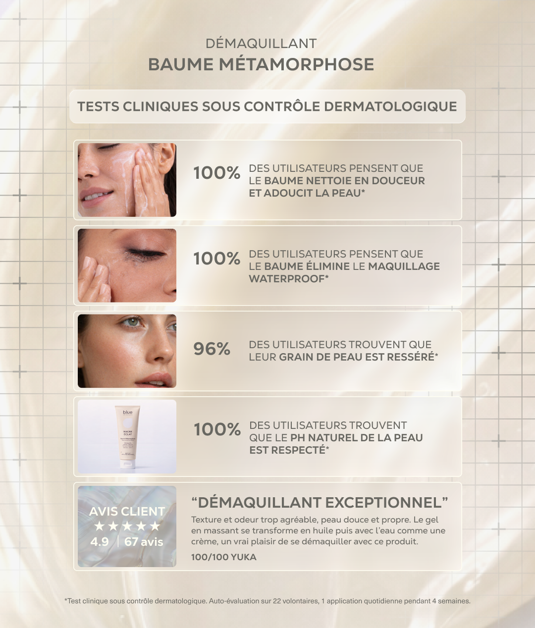 Ce baume innovant associe efficacité démaquillante et respect de l’équilibre cutané grâce à notre technologie exclusive Gel D-Phase, qui transforme la texture au contact de l’eau.