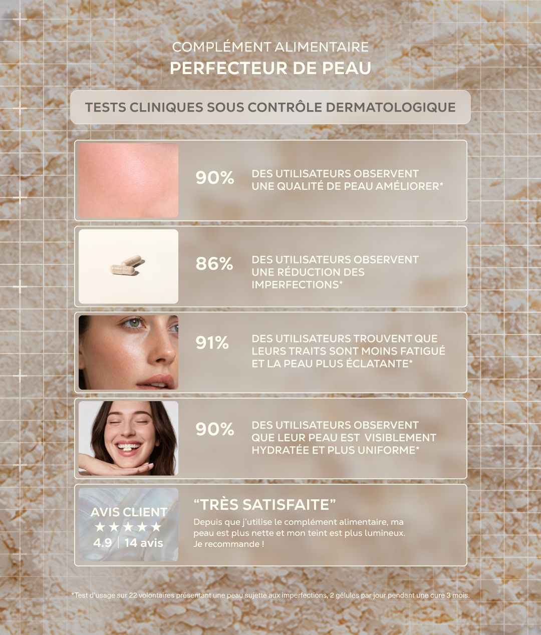 Un programme nutritionnel conçu pour soutenir la peau de l’intérieur, notamment en cas de teint terne ou d’imperfections.