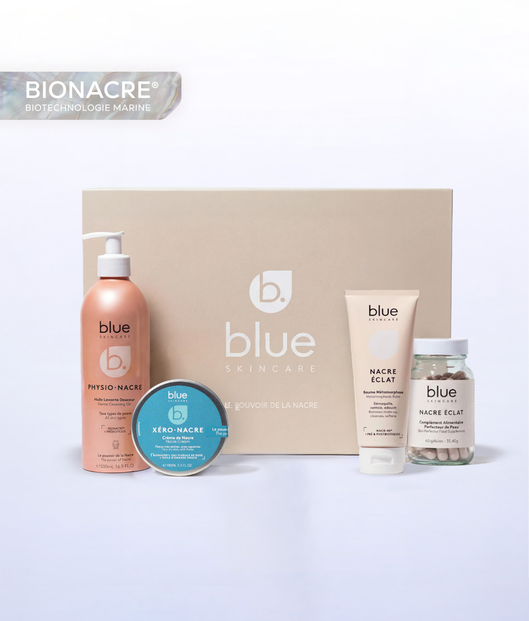 Un rituel global Blue Skincare, conçu pour agir à chaque étape : nettoyer, régénérer, protéger… et nourrir la peau de l’intérieur.