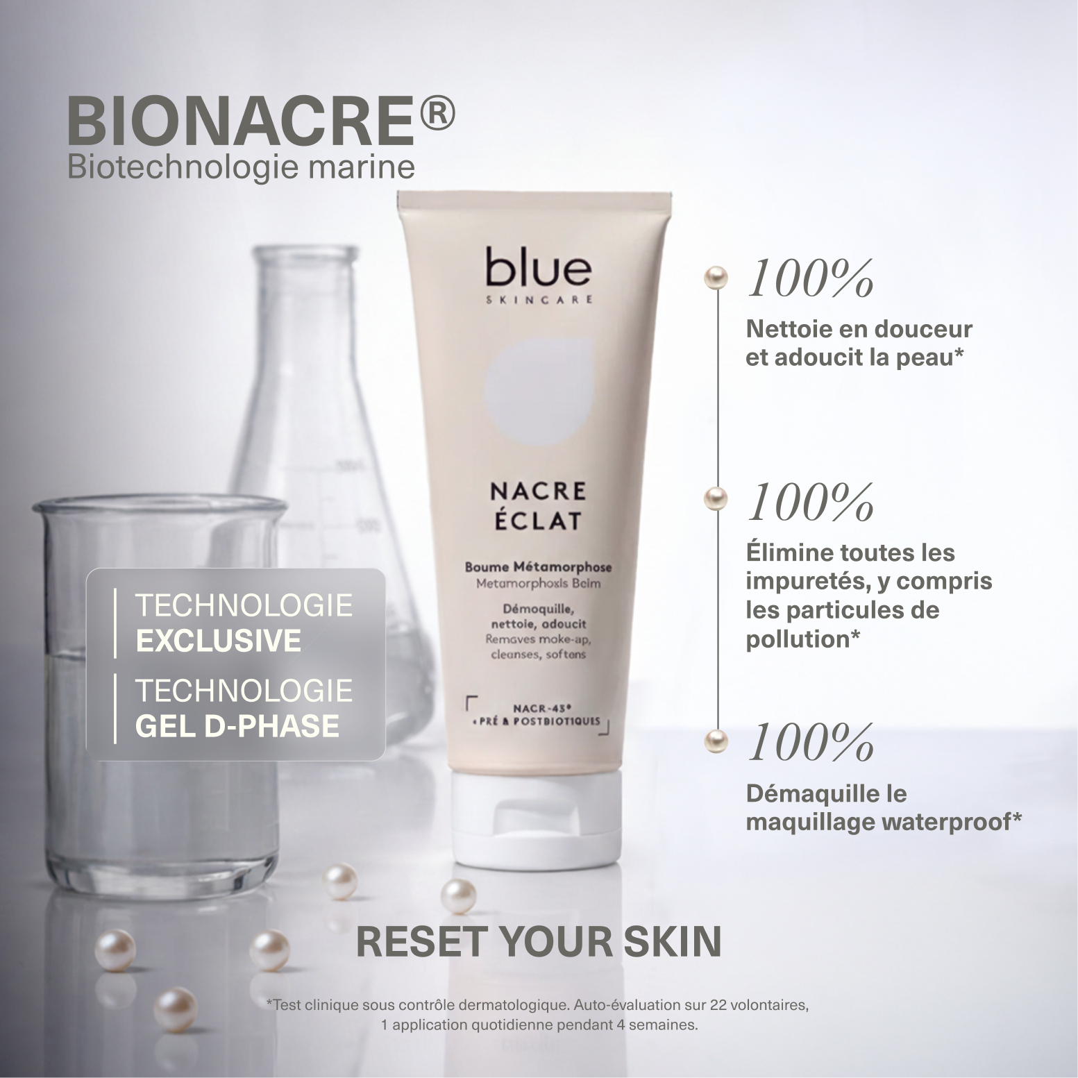 En associant ingrédients d’origine naturelle et biotechnologie marine BIONACRE®, il accompagne la peau à chaque étape :
