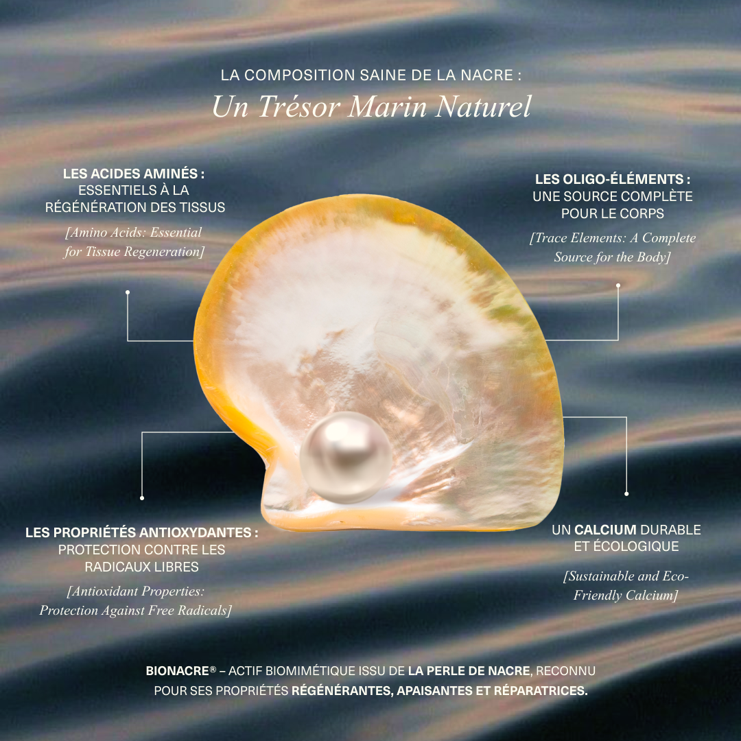 经过 15 年的研究,我们独特的专利技术保留了活性珍珠母双有机矿物基质的完整性和纯度。